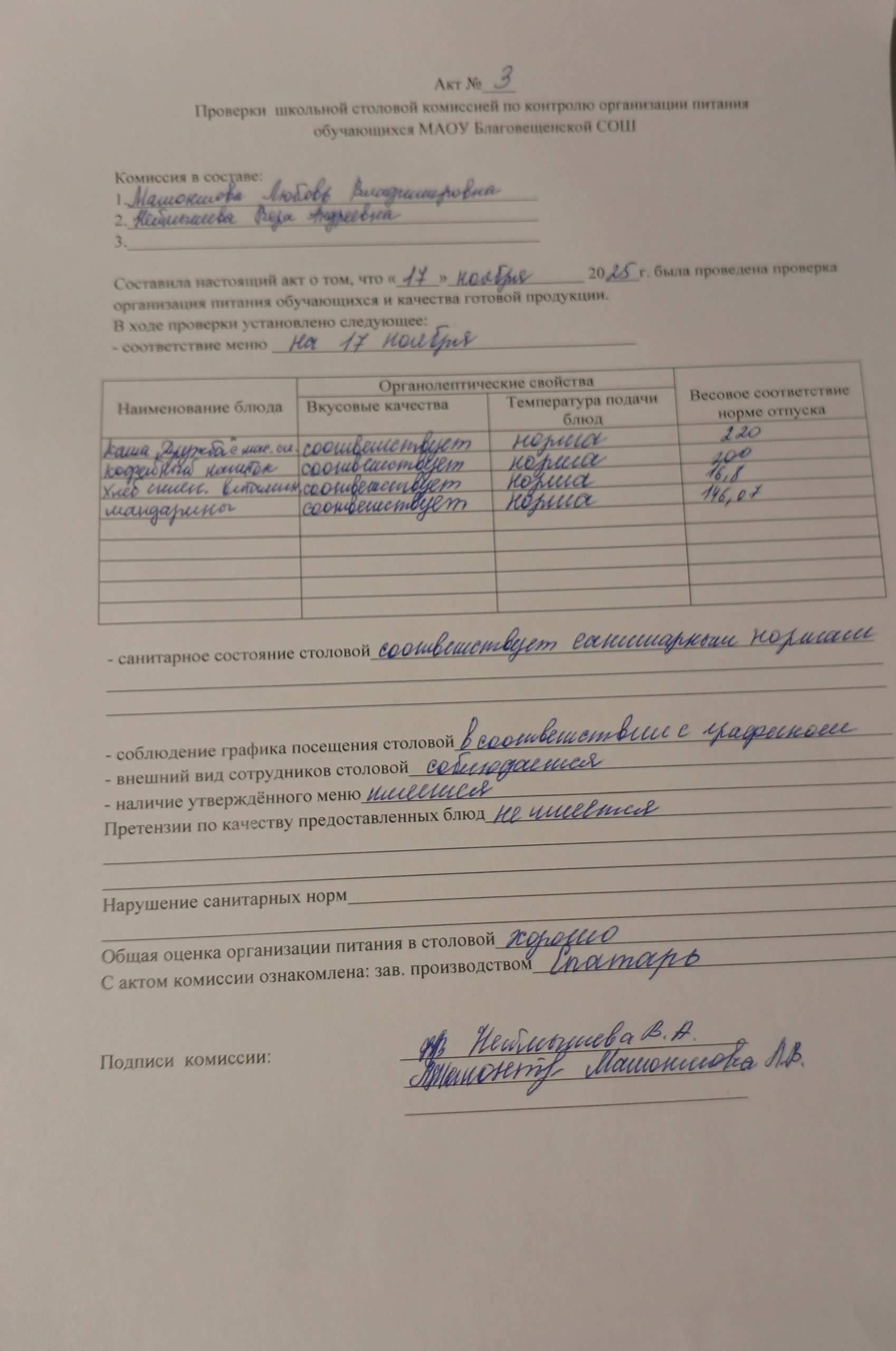 Акт проведения комиссией по контролю за организацией питания обучающихся ноябрь 2025