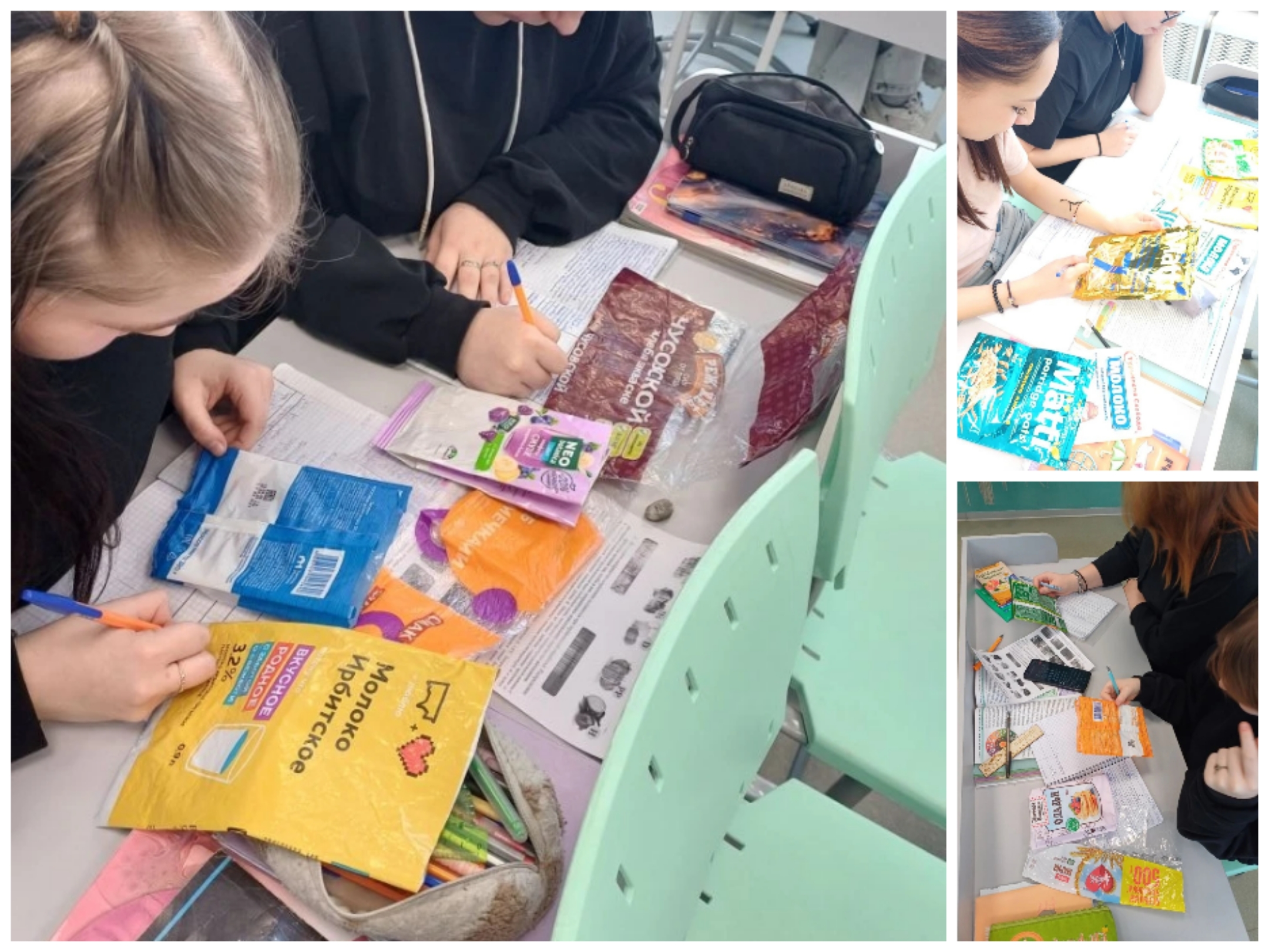 В ходе работы школьники заполняли таблицу, используя данные об энергетической ценности питательных веществ разных продуктов: печенья, сока, молока, слоёного теста, хлеба. Данные дети брали на пакетах, коробках и упаковочных мешочках от продуктов.