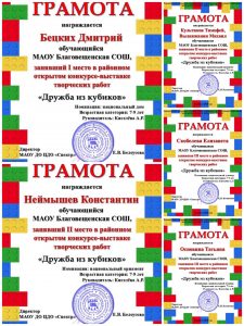 Воспитанники, посещающие дополнительную  общеразвивающую образовательную программу «Робототехника» приняли участие в муниципальном конкурсе «Дружба из кубиков». Конкурс проводился в рамках мероприятий, посвященных 2026 году, объявленному в России Годом единства народов России. Организатором конкурса-  муниципальное автономное образовательное учреждение дополнительного образования Центр дополнительного образования «Спектр». Школьники  моделировали различные объёмные модели, демонстрирующие  национальные дома, сувениры из конструктора «Клик» и других конструкторов. Основная цель конкурса —  популяризация технического творчества среди  младших школьников, формирование основ инженерных компетенций и развитие креативности. На конкурс представлено 5 работ, все участники заняли призовые места.