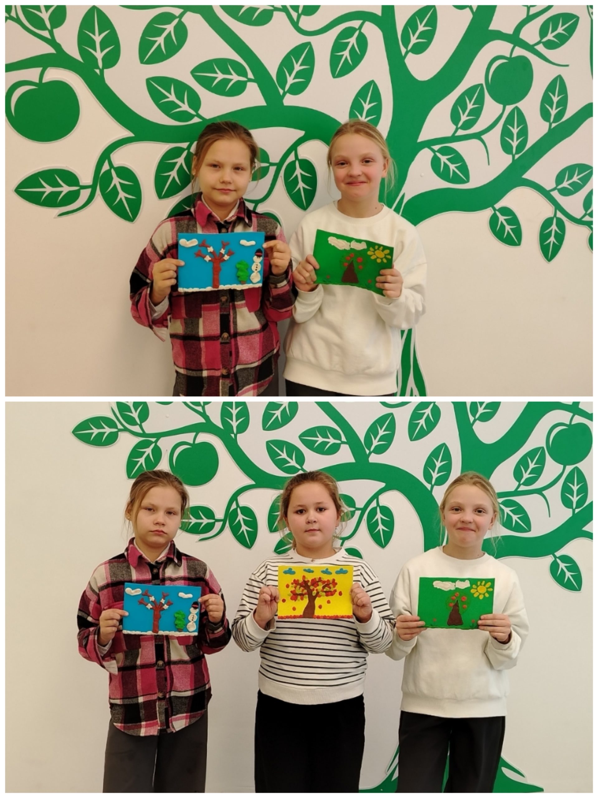 19 января прошло очередное занятие ДООП «Эколята». Тема занятия «Создание аппликация «Времена года». На  занятии ребята узнали о том, как происходит смена времен года, подробно изучили признаки зимы. Рассмотрели  какие бывают сезонные изменения в природе, понаблюдали  зимний пейзаж на улице.  Затем  изготовили аппликацию «Времена года» с помощью картона и пластилина.